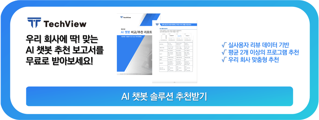여러 AI 솔루션 중 가장 많이 사용되는 도구가 챗봇일 것 입니다. 테크뷰에서는 다양한 AI 챗봇 솔루션 중에 최적의 제품을 선택할 수 있도록 지원해드리고 있습니다. 이를 위해 ChatGPT, Claude와 같은 LLM부터 검색 기반의 Perplexity, 또는 회사 기업 정보를 학습 시킨 커스텀 챗봇까지 다양한 AI 챗봇 비교 리포트를 송부드립니다. 비교/추천 리포트가 필요하신 기업 담당자 분들은 위에 이미지를 클릭하여 설문을 작성해주시면 됩니다.